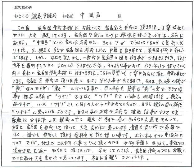 又、親戚の中に親父が今まで全く知らない人達も沢山いて、本当に家系図を作成して頂いて大変良かったと思っています。費用も良心的で高額でなく、誰でも作成して頂ける低料金な所も嬉しい事です。インターネットからの申し込みについてですが、地元でこれだけの事をやって頂くのにはかなり高額になります。貴社では進行状況を逐一知らせて頂けるので、安心していました。家系図作成のプロにお願いできた事は大変良かったと思っています。本当に有難うございました。
